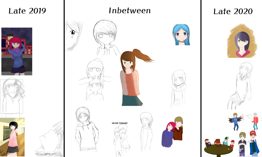 Below is an image showing the progress from late 2019 to late 2020. There’s a lot of doodles and not complete images, this was mainly because I got into the habit of just doing quick doodles and was unable to spend hours working on one thing. You can probably find some downgrades in my most recent stuff compared to late 2019, but recently I’ve been trying to experiment with my art style and come up with new and easier ways to draw things (which I believe has helped a lot)