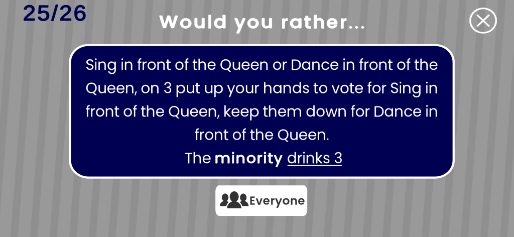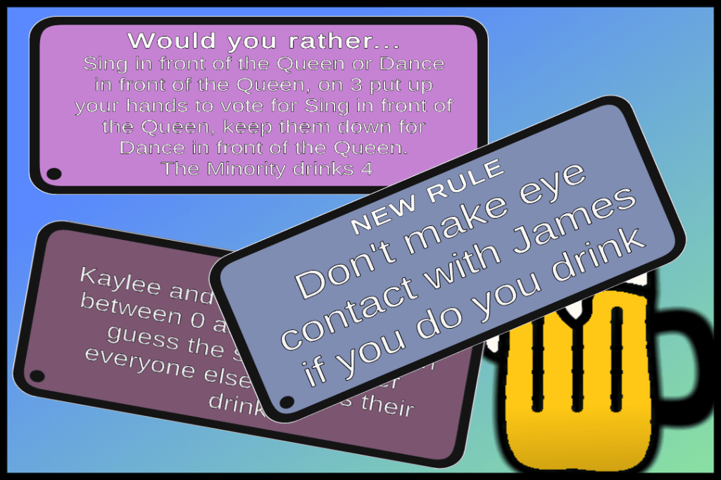 As for the future of the game, there are a few major updates planned. I won’t say what I’ve got planned, but there will be at least two new game modes and one new way to spice up the night. As always, all updates will add new cards to all modes and fix other broken cards. If you’ve played the game and found a card that doesn’t work or seems out of place, comment below and I’ll fix it.